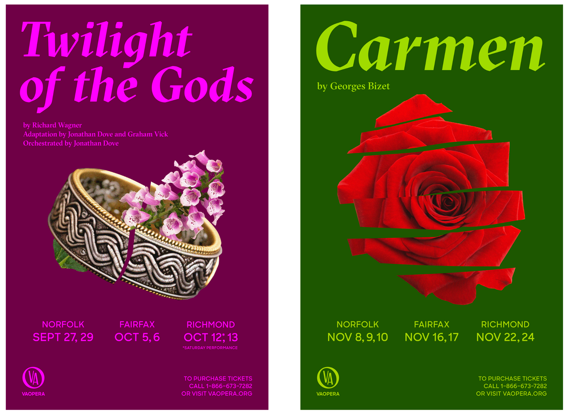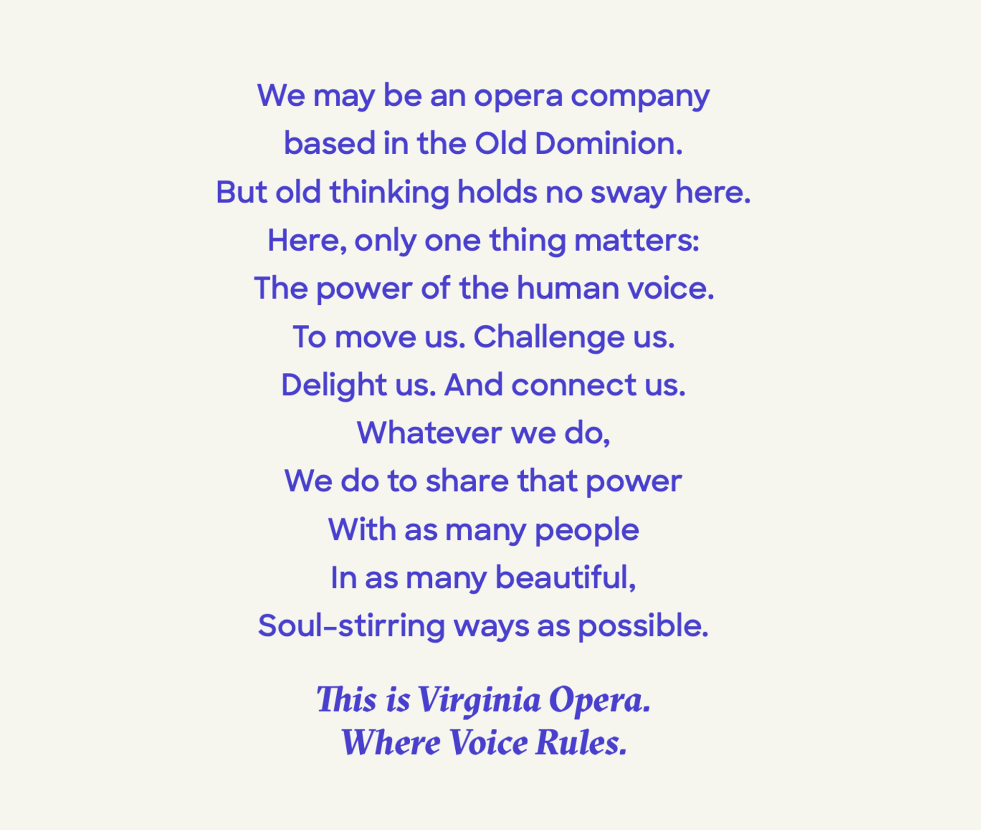 with a new managing director and a slate of exciting new productions ahead of it, Virginia opera was ready for a rebranding effort. I crafted an all new brand platform—"Where Voice rules"—and oversaw (with magnus Hierta) the creation of a new logo and brand guidelines from Portland's OMFGCO.